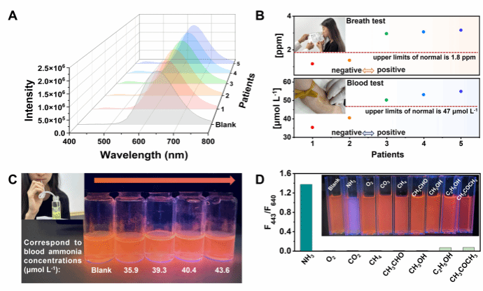 面向“健康中国2030”国家重大需求战略指引,实现呼出气中病理标识物的精准监测具有重要意义。氨气作为肝肾疾病的生物标志物,肝肾异常代谢会导致氨分子在体内不完全转化和积累,患者血液和呼气中的氨浓度显著高于一般人群。实现痕量氨气的快速精准检测,将有望替代传统耗时的血氨检测,成为肝肾疾病早期呼吸诊断、实时生理检测的新途径。