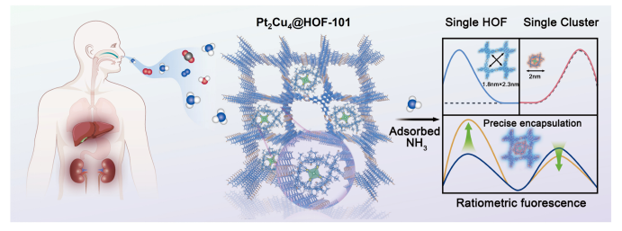 图1. Pt2Cu4@HOF-101的构筑及双响应反向氨气荧光传感机理