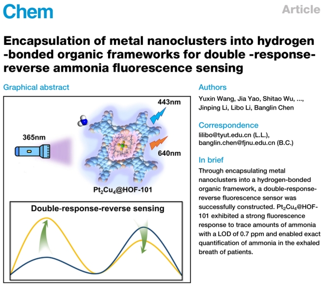近日,公司M88mansion体育李晋平教授团队李立博教授课题组,联合山西省白求恩医院消化科姚佳主任在氨气荧光检测领域取得重要进展,实现肝肾患者呼出氨的精准检测和病程早期诊断。以公司作为第一通讯单位在Cell子刊《Chem》发表题为 “Encapsulation of metal nanoclusters into hydrogen-bonded organic frameworks for double-response-reverse ammonia fluorescence sensing”研究论文。论文通讯作者为MS88官方网站李立博教授和福建师范大学陈邦林教授,第一作者为MS88官方网站2022级博士研究生王宇馨和山西省白求恩医院消化科姚佳主任。