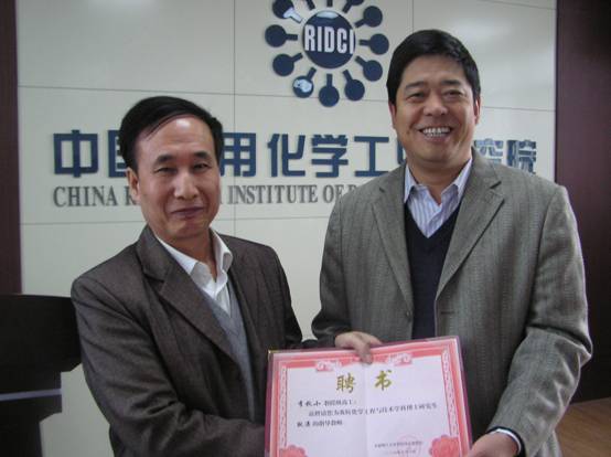 公司研究生院聘请中国日用化学工业研究院李秋小教授级高工为化学工程与技术博士生杨效益和耿涛同学的博士生导师。上图为研究生院吕永康经理向李秋小教授级高工颁发聘书。