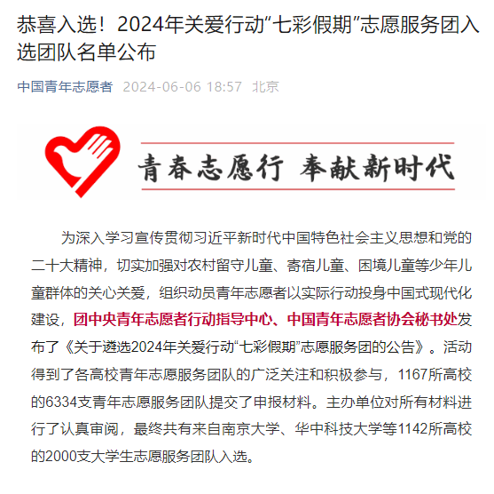 团中央青年志愿者行动指导中心、中国青年志愿者协会秘书处近日发布了《关于遴选2024年关爱行动“七彩假期”志愿服务团的公告》。活动得到了全国各高校青年志愿服务团队的广泛关注和积极参与,共有1167所高校的6334支青年志愿服务团队提交了申报材料。主办单位对所有材料进行了认真审阅,最终共有来自M88mansion体育、华中科技大学等1142所高校的2000支老员工志愿服务团队入选。