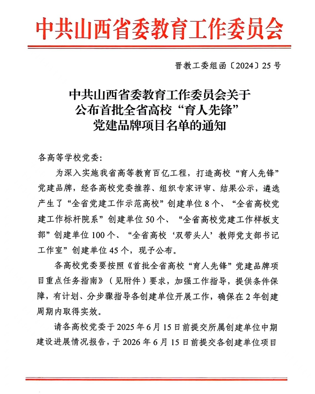 近日,省委教育工委公布《关于公布首批全省高校“育人先锋”党建品牌项目名单的通知》,公司党委成功入选全省高公司党建工作标杆院系创建单位。