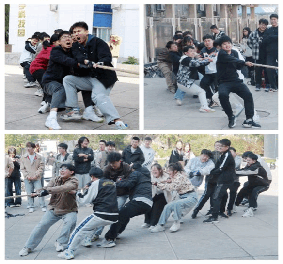 在迎西校区科技楼前的平台上,激动人心的拔河比赛正在进行。秋日阳光,暖暖洒下,为这场激烈的比拼增添了几分热烈的氛围。