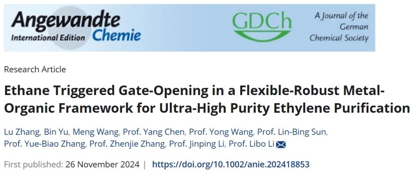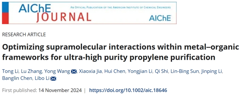 公司李晋平教授团队李立博教授课题组在该领域持续攻关,时隔六年在高选择性烷烃吸附材料研发方面取得重要进展,实现对乙烷/乙烯、丙烷/丙烯选择性与吸附容量的显著提升,相继在国际化学知名期刊《Angew. Chem. Int. Ed.》和化工知名期刊《AIChE Journal》发表题为 “Ethane Triggered Gate-Opening in a Flexible-Robust Metal-Organic Framework for Ultra-High Purity Ethylene Purification”和“Optimizing supramolecular interactions within metal-organic frameworks for ultra-high purity propylene purification” 研究论文。